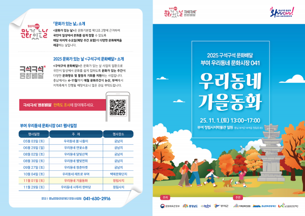 [충청중심뉴스] 충남문화관광재단은 ‘문화가 있는 날’ 주간을 맞아 오는 11월 1일 오후 1시부터 오후 5시까지, 부여 정림사지에서 ‘2025 구석구석 문화배달’부여 7회차 ‘우리동네 가을동화’를 개최한다.