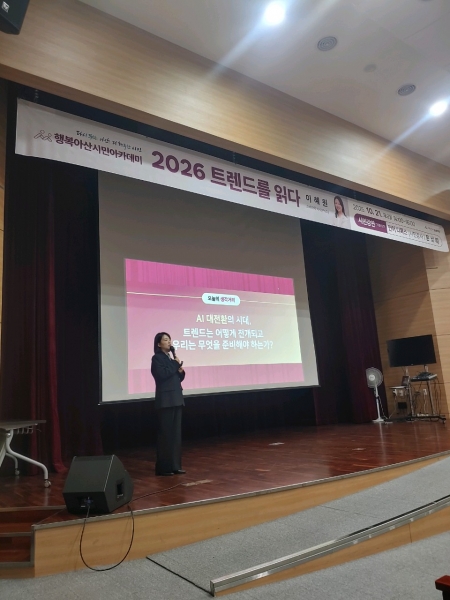 [충청중심뉴스] 아산시는 21일 배방읍 행정복지센터 다목적홀에서 ‘행복아산 시민아카데미’ 다섯 번째 강연으로 이혜원 교수의 ‘2026 트렌드를 읽다’ 특강을 개최했다고 밝혔다.
