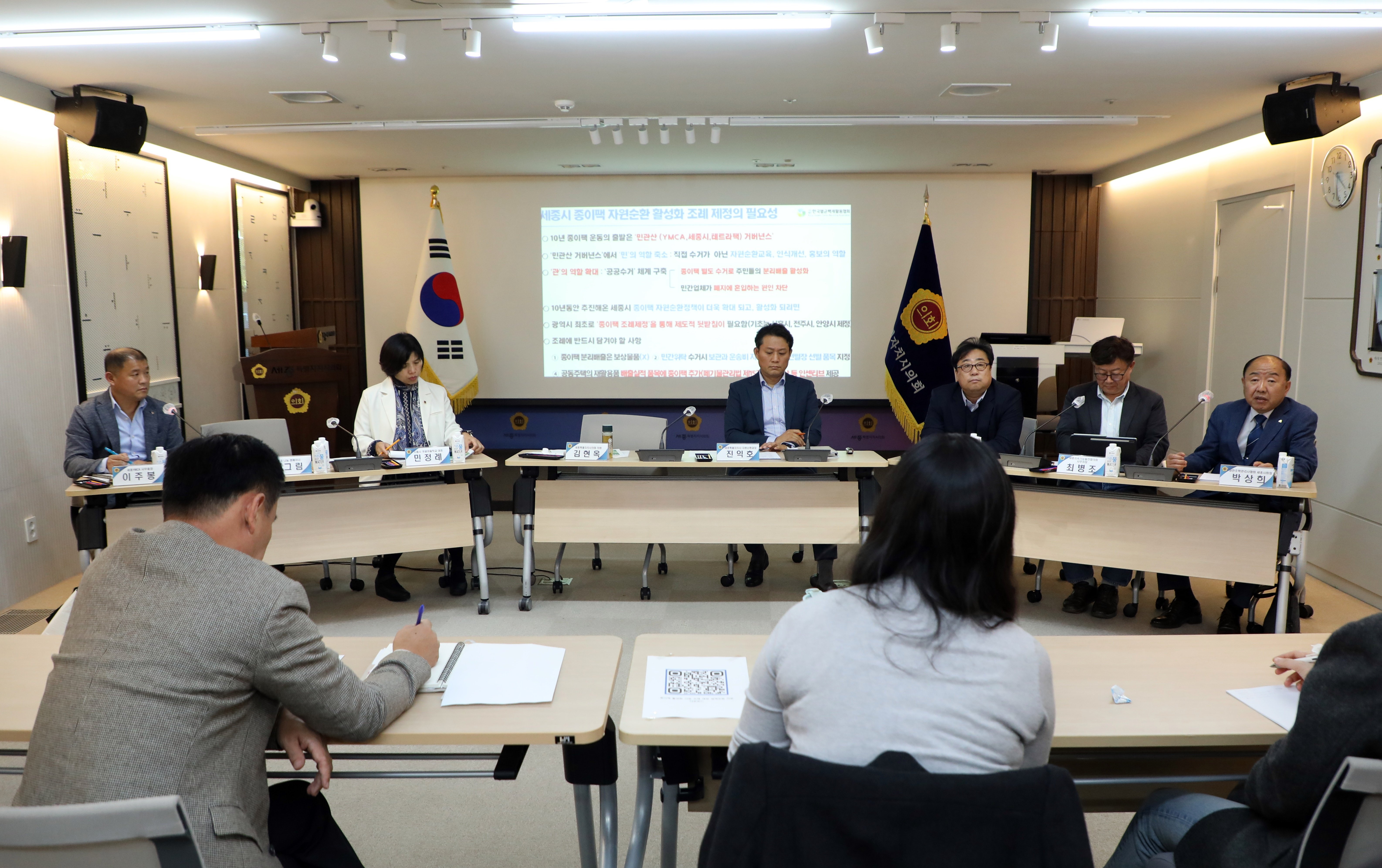 이에 대해 진익호 과장은 현재 세종시의 종이팩 수거 현황(25년 9월 현재 704개소 참여, 월 7.4t 수거 등)과 노력들을 설명하며 조례 제정의 필요성에 공감하고 시의회에서 조례가 제정되면 적극 협력해 추진하겠다는 의지를 밝혔다.