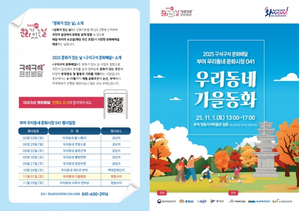 [충청중심뉴스] 부여군은 오는 11월 1일 오후 1시부터 5시까지 정림사지 일원에서 ‘2025 문화가 있는 날 ‘구석구석 문화배달’’ 일곱 번째 이야기 ‘우리동네 가을동화’를 개최한다고 밝혔다.