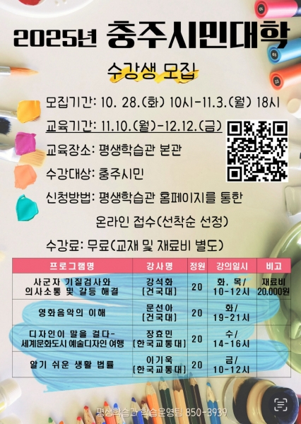 [충청중심뉴스] 충주시가 지역대학과 협력해 추진하는 ‘2025년 충주시민대학’의 수강생을 모집한다고 밝혔다.