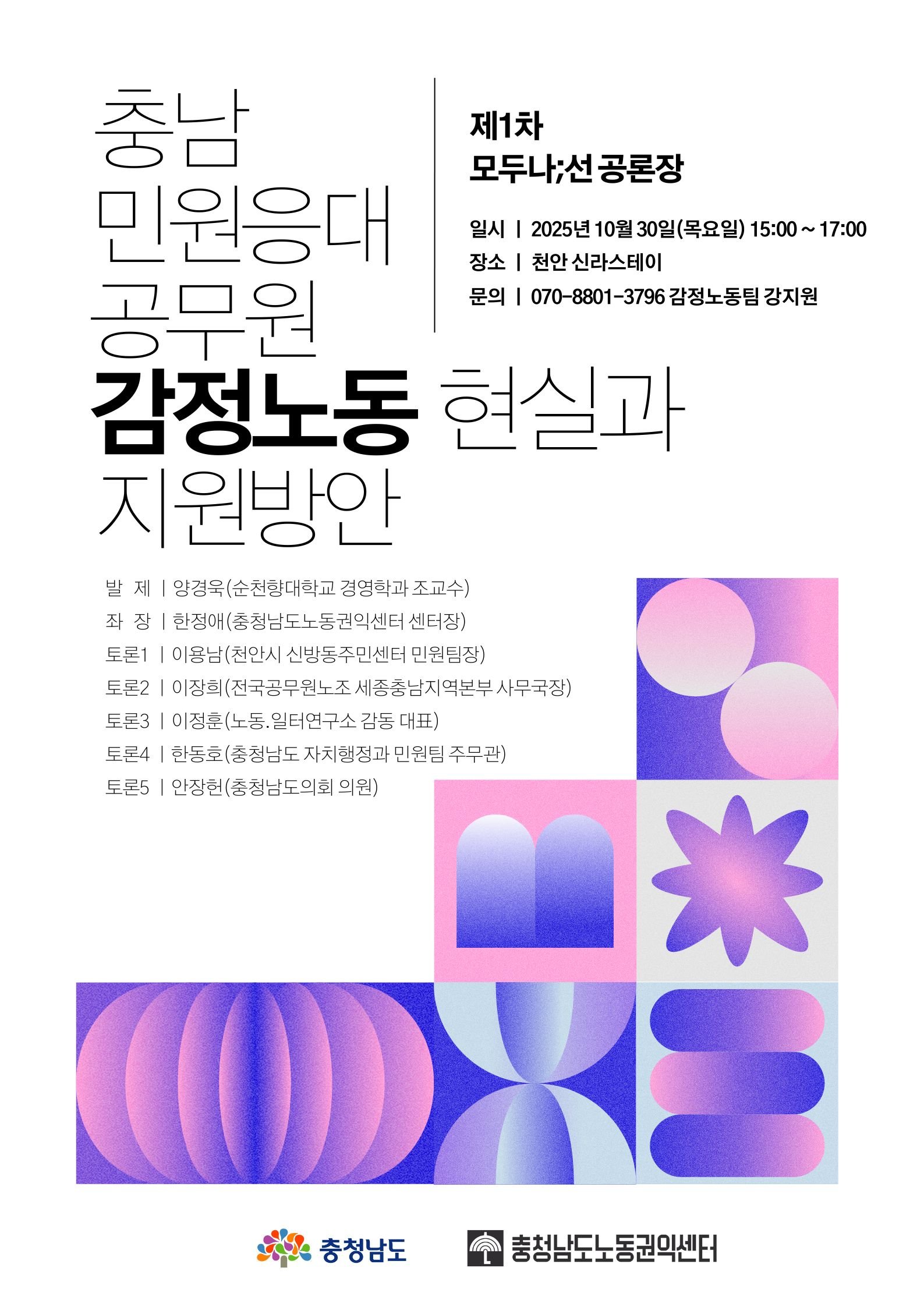 [충청중심뉴스] 충청남도노동권익센터(센터장 한정애)는 오는 10월 30일(목) 오후 3시 천안 신라스테이 BANQUET 1에서 ‘제1차 모두나;선 공론장 : 충남 민원응대 공무원 감정노동 현실과 지원방안'을 개최한다. 이번 공론장은 충청남도노동권익센터가 실시한 민원응대 공무원의 마음건강실태조사 결과를 기반으로 지역 민원응대 공무원들이 겪고 있는 감정노동의 수준과 현실을 심층적으로 진단하고 실효성 있는 대응책을 마련하기 위해 기획됐다. 최근 3년간 전국적으로 민원응대 공무원의 자살 사건이 잇따르며 공직사회의 ‘심리재해'가 심각한 사회문제로 대두되고 있다.