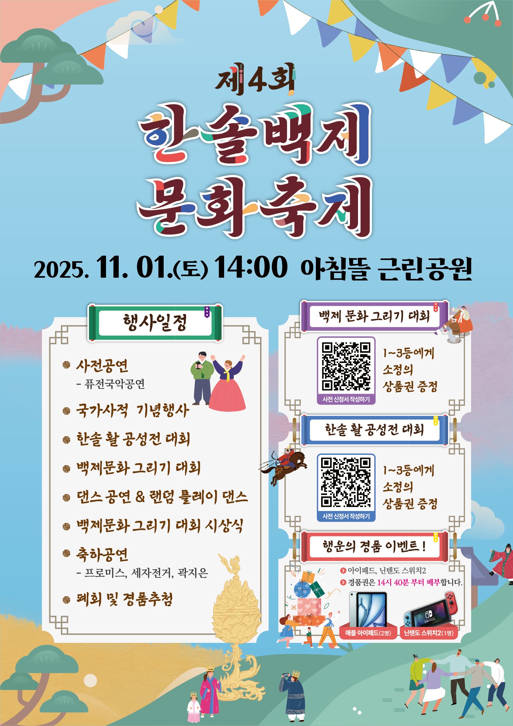 이어 오후 2시부터 7시 40분까지 아침뜰근린공원에서는 ‘제4회 한솔백제문화축제’가 개최된다.