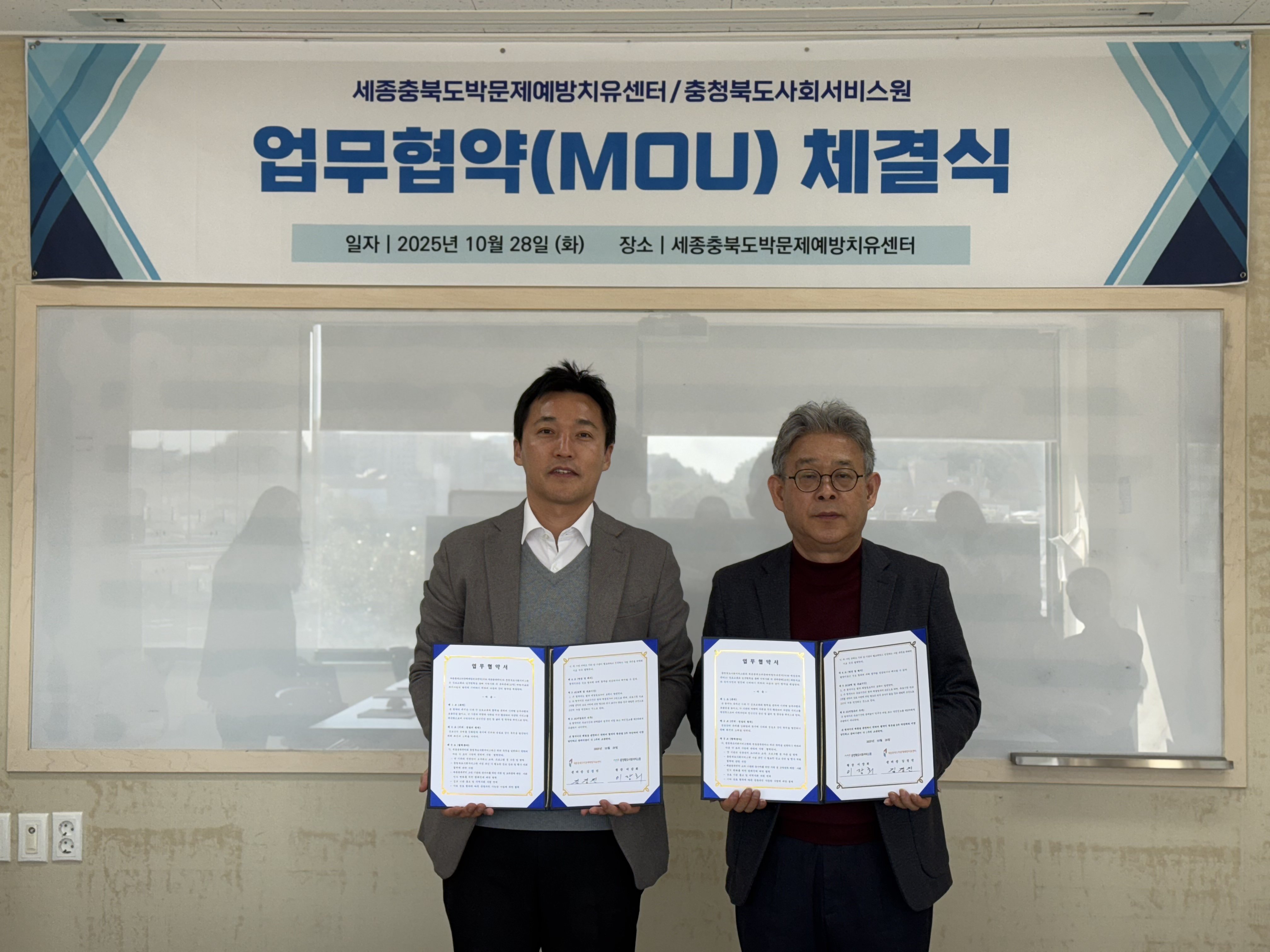 [충청중심뉴스] 충청북도사회서비스원(원장 이장희)과 세종충북도박문제예방치유센터(센터장 김경진)는 2025년 10월 28일(화) 오전 11시, 세종충북도박문제예방치유센터 회의실에서 도민의 정신건강 증진 및 삶의 질 향상과 사회서비스 협력체계 강화를 위한 업무협약(MOU)을 체결했다.