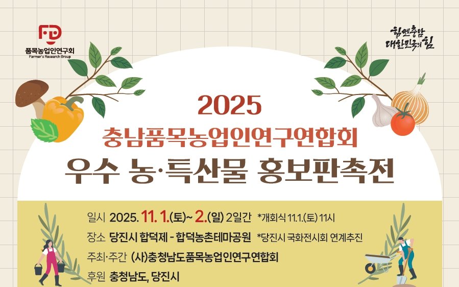 [충청중심뉴스] 충남도 농업기술원은 다음달 1일부터 2일까지 당진시 합덕농촌테마공원에서 ‘충남 우수 농·특산물 홍보판촉전’을 개최한다고 29일 밝혔다.