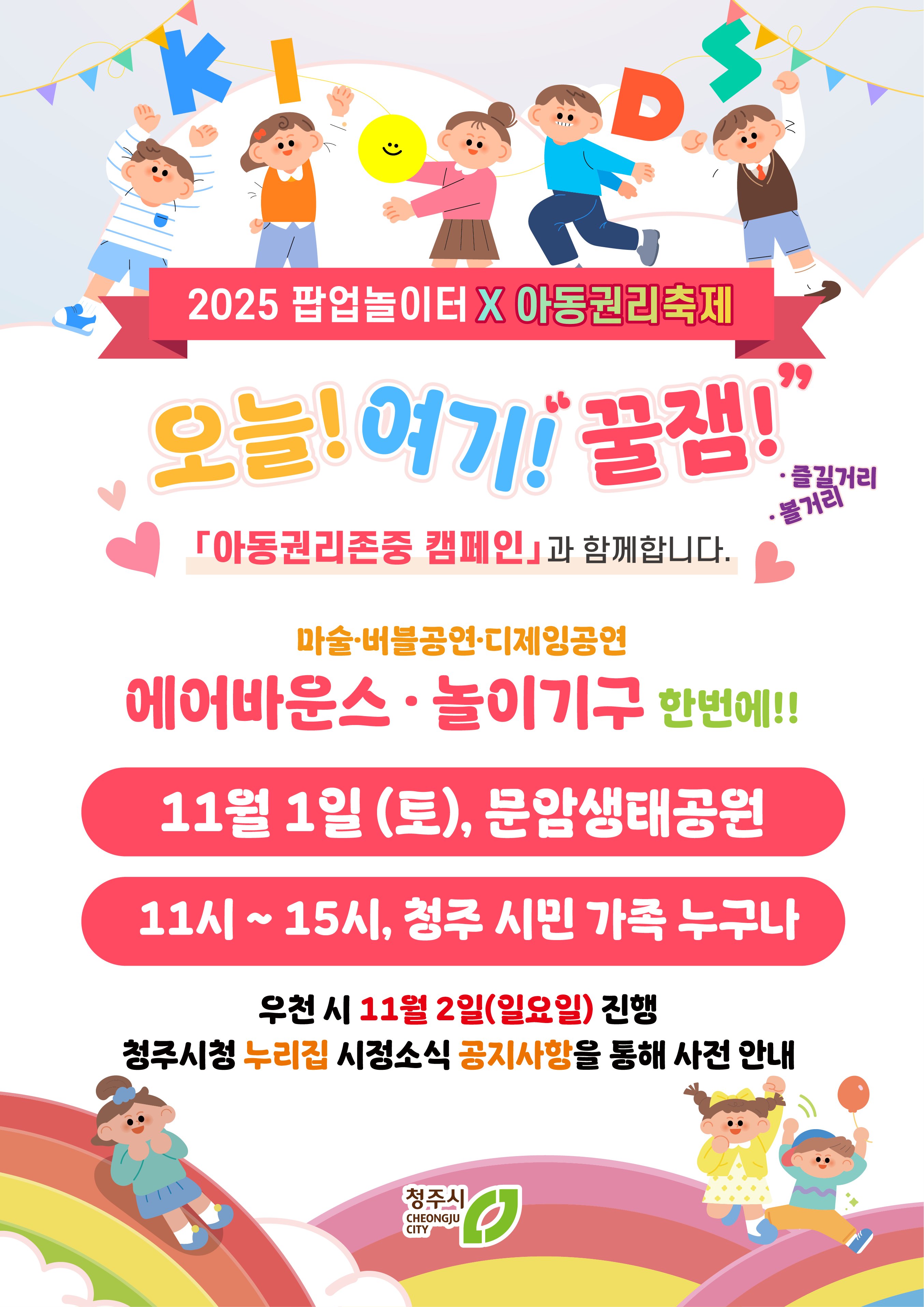 시 관계자는 “올 한 해 8회에 걸쳐 운영된 팝업놀이터가 시민들의 큰 호응 속에 마무리되고 있다”며 “내년에도 아이들이 더 즐겁고 안전하게 놀 수 있도록 팝업놀이터를 이어가고 아동권리가 존중받는 도시, 청주를 만들어가겠다”고 말했다.