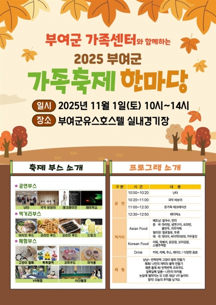 [충청중심뉴스] 부여군 가족센터는 오는 11월 1일 오전 10시부터 오후 2시까지 부여군유스호스텔 실내경기장에서 ‘2025년 부여군 가족축제 한마당’을 개최한다고 밝혔다.