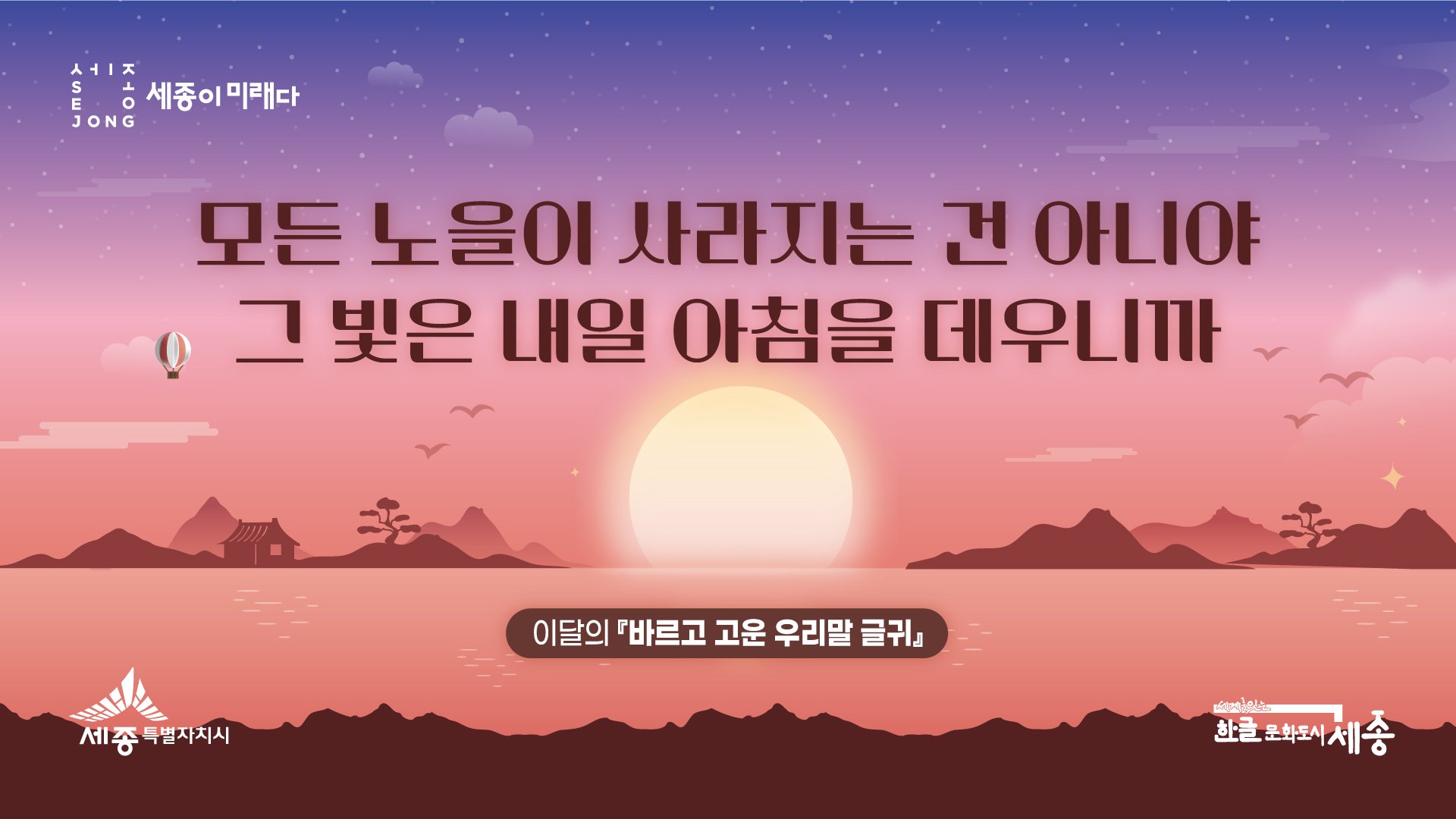 [충청중심뉴스] ‘모든 노을이 사라지는 건 아니야 그 빛은 내일 아침을 데우니까’세종시가 시민 참여로 선정한 11∼12월 ‘바르고 고운 우리말 글귀’를 발표했다.