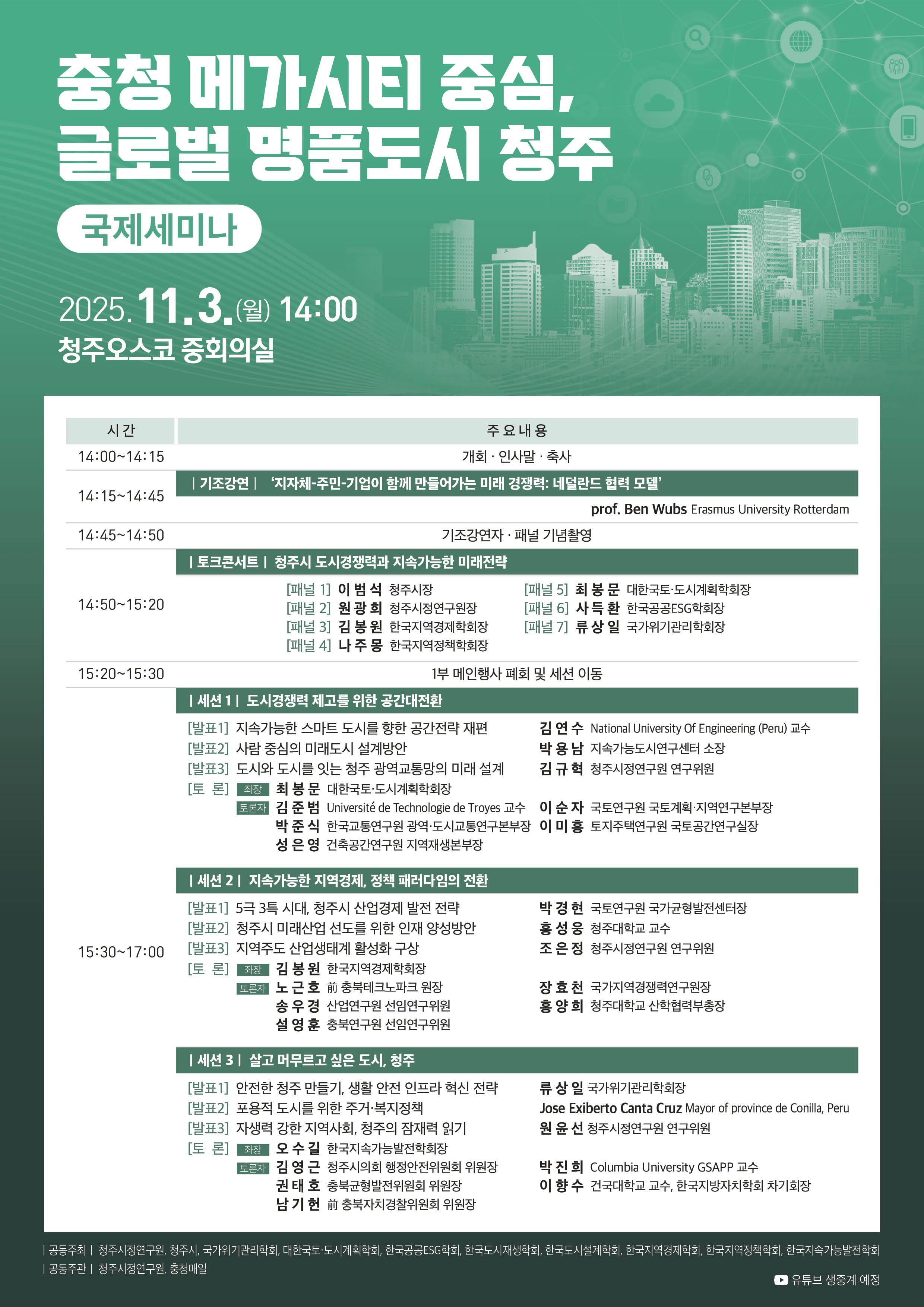 이외에도 각 세션에는 김연수 페루공과대학교 교수, 홍성웅 청주대학교 교수, 류상일 국가위기관리학회장을 비롯해 청주시정연구원 김규혁 연구위원과 원윤선 연구위원의 주제발표도 포함됐다.