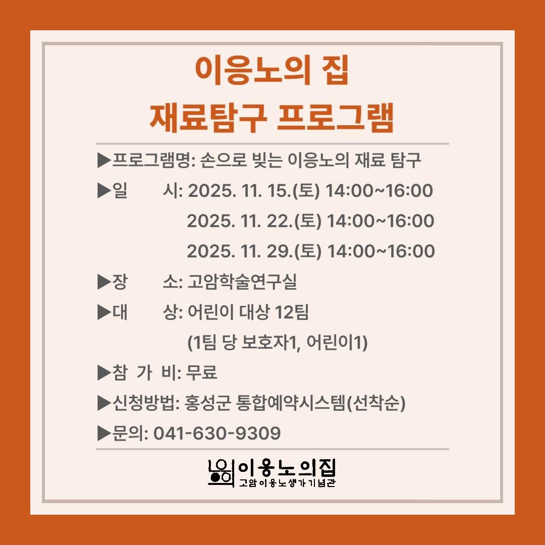 [충청중심뉴스] 홍성군 고암이응노생가기념관은 오는 15일 22일 29일 오후 2시부터 4시까지 ‘재료탐구 프로그램’을 운영한다고 밝혔다.