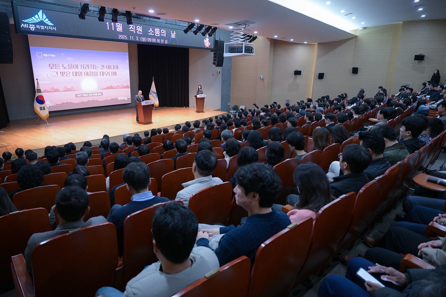 최민호 시장은 3일 시청 여민실에서 열린 11월 직원 소통의 날 행사에서 예측 불가능한 인공지능 시대에 꼭 필요한 것은 지도자의 올바른 시대정신과 공직자의 책임감이라고 역설했다.