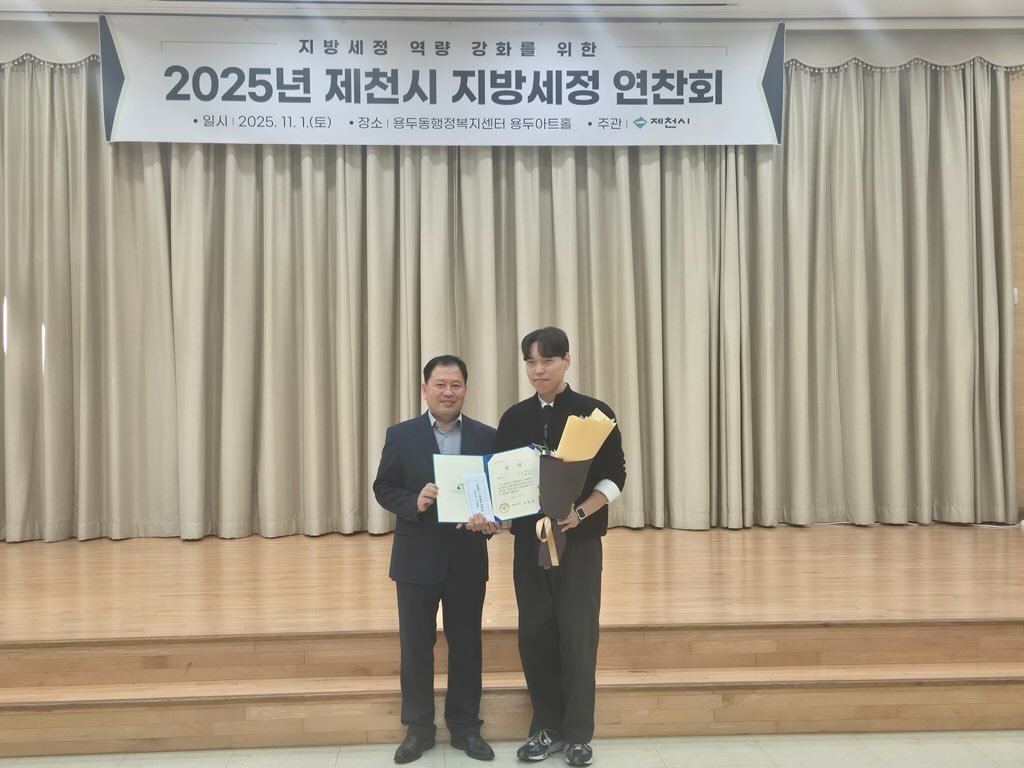 연구과제 발표 결과 “지속가능한 관광발전을 위한 관광세 도입 방안”을 발표한 세무과 세무9급 최주호주무관이 최우수를 차지하는 영예를 얻었으며 최우수 수상자는 2026년 개최되는 충청북도 주관 지방세정 연찬회 제천시 대표로 참가하게 된다.