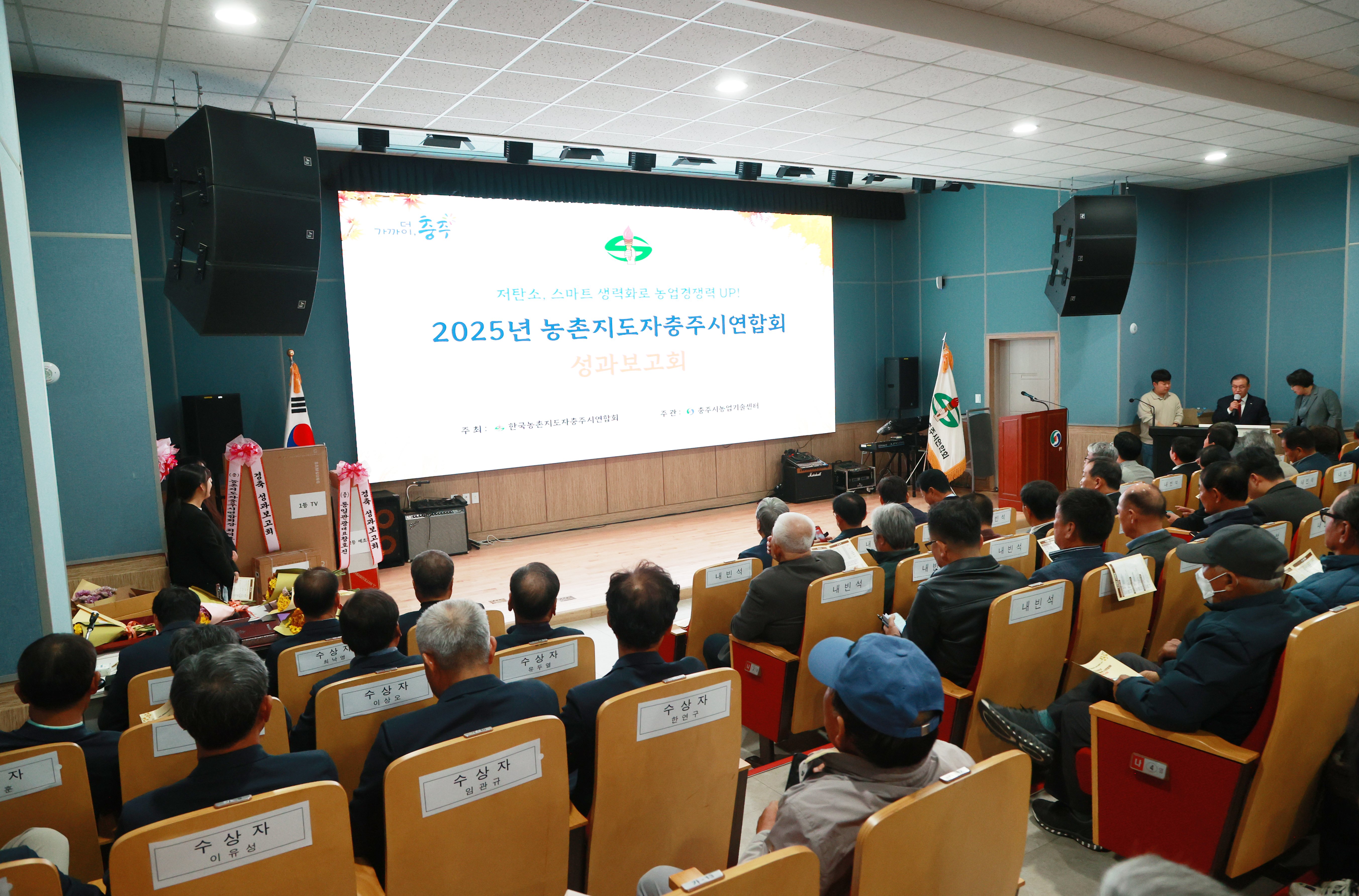 ‘저탄소, 스마트 생력화로 농업 경쟁력 UP’이란 주제로 열린 이날 성과보고대회는 17개 읍면동 회원이 한자리에 모여 이상기후 대응 및 스마트 농업을 위해 다양한 영농 성과를 공유하고자 마련됐다.