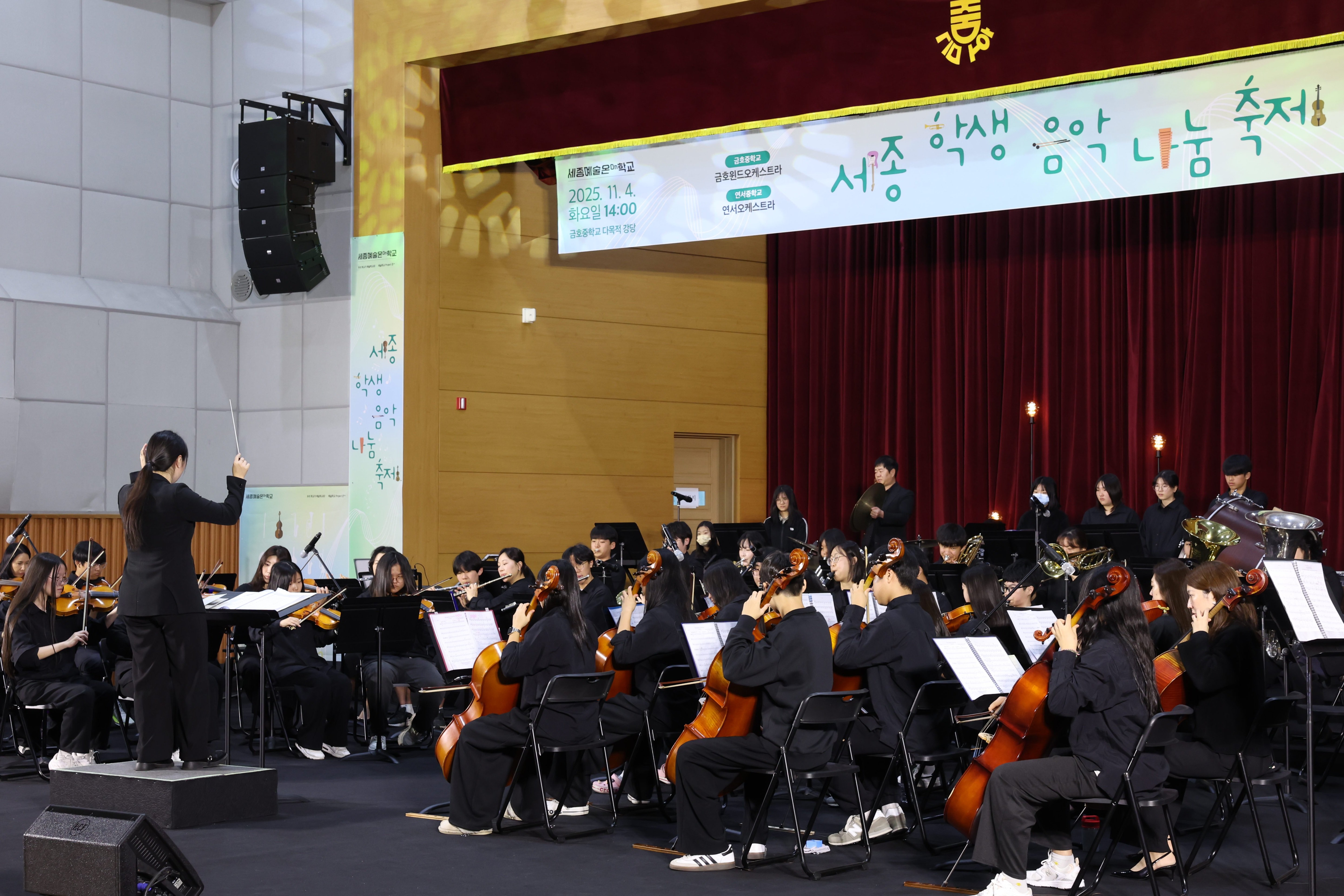 [충청중심뉴스] 세종시교육청은 11월 4일에 금호중학교 다목적강당에서 금호중학교의 ‘금호윈드오케스트라’와 연서중학교의 ‘연서오케스트라’가 함께 만드는 ‘2025 세종예술온학교’예술학교 ‘세종 학생 음악 나눔 축제’를 성황리에 마쳤다.