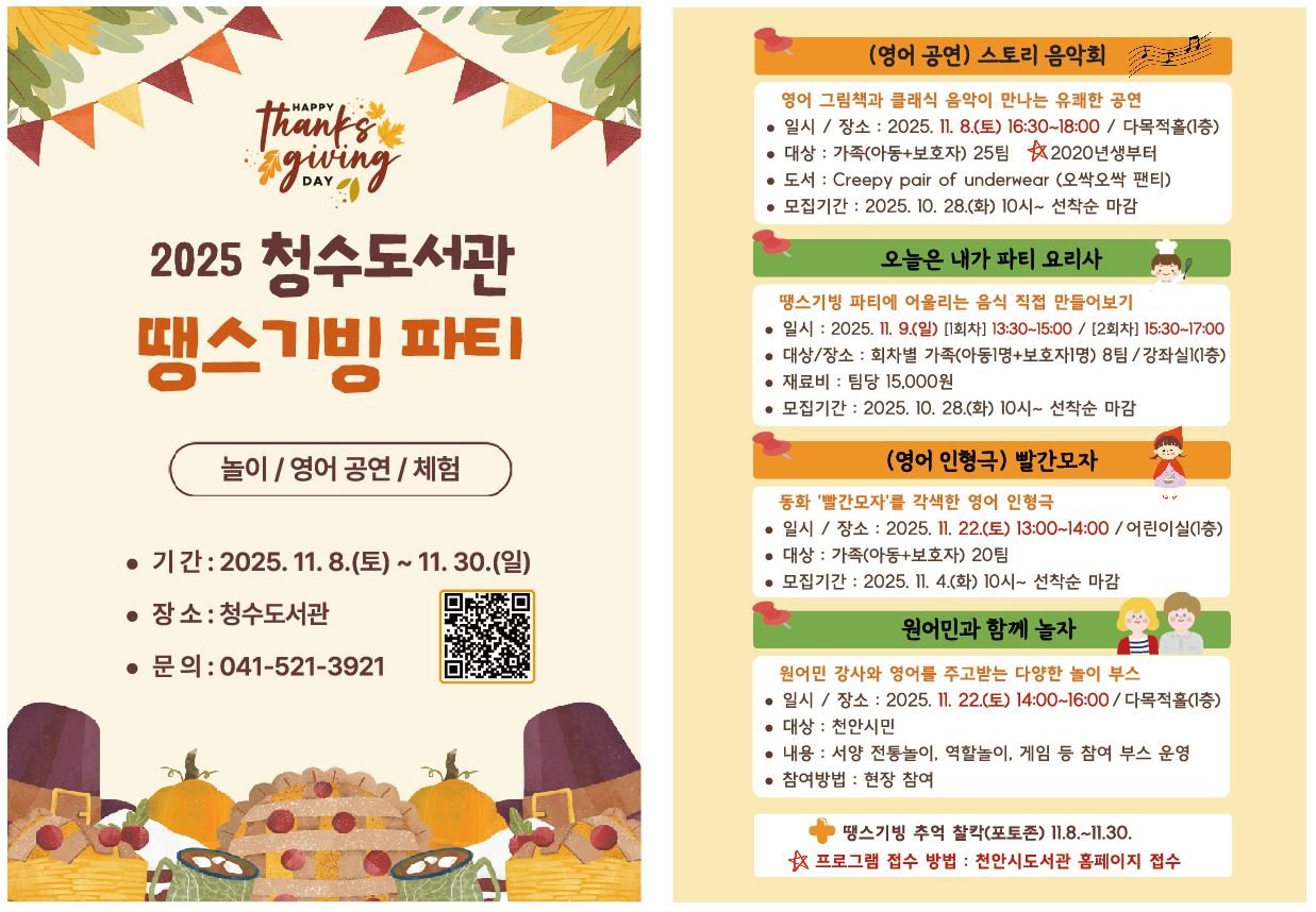 [충청중심뉴스] 천안시 청수도서관은 오는 8~ 30일 ‘2025 땡스기빙 파티’를 연다고 6일 밝혔다.