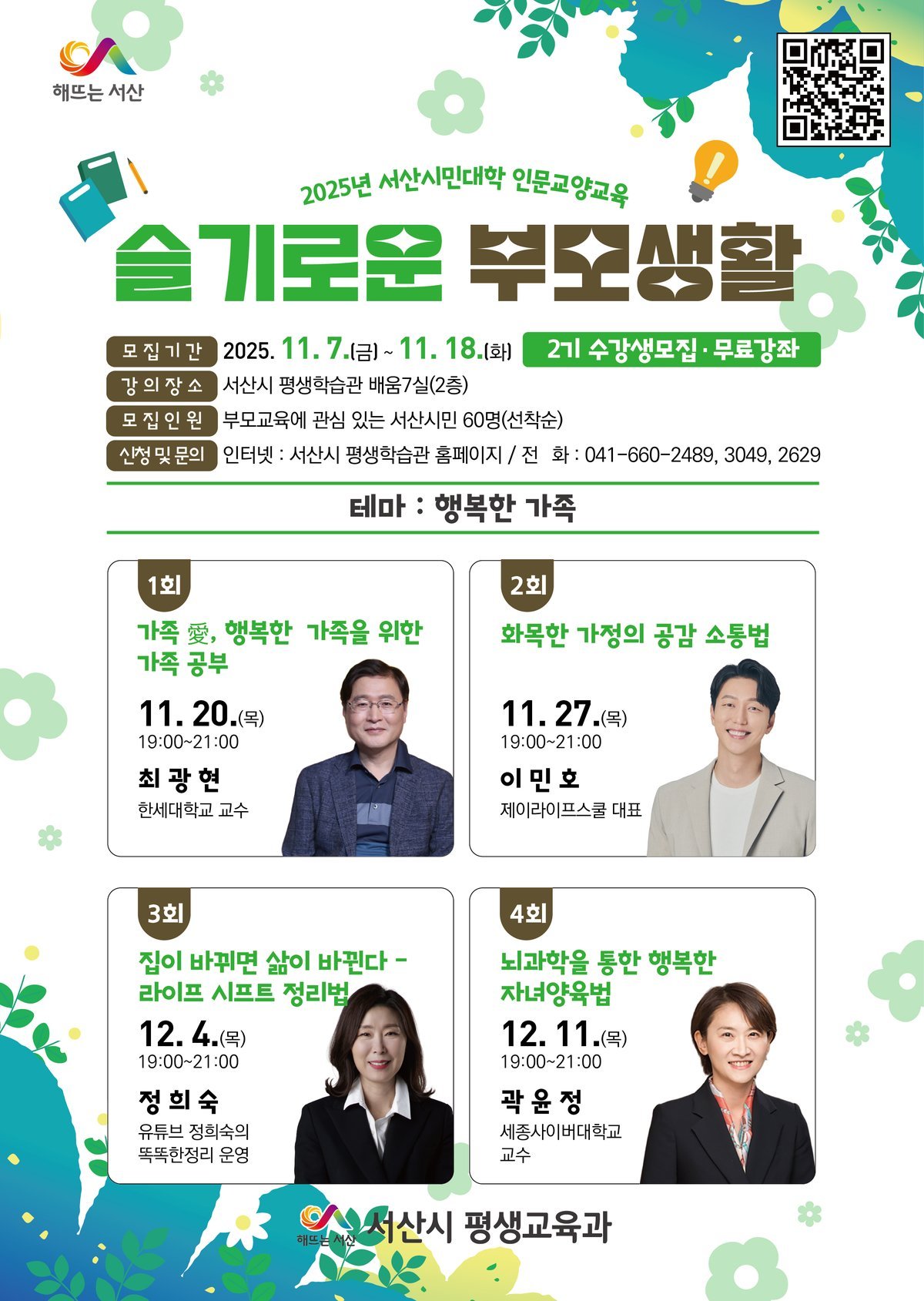 성기영 평생교육과장은 "삶의 중심이 되는 가족의 행복을 위해 부모의 역할을 새롭게 바라보고자 이번 프로그램을 마련했다"며 "가정 내 소통 방법부터 자녀의 성장을 돕는 실천 전략까지 다양한 주제를 통해 학부모들이 공감하고 배울 수 있는 시간이 될 것"이라고 말했다.