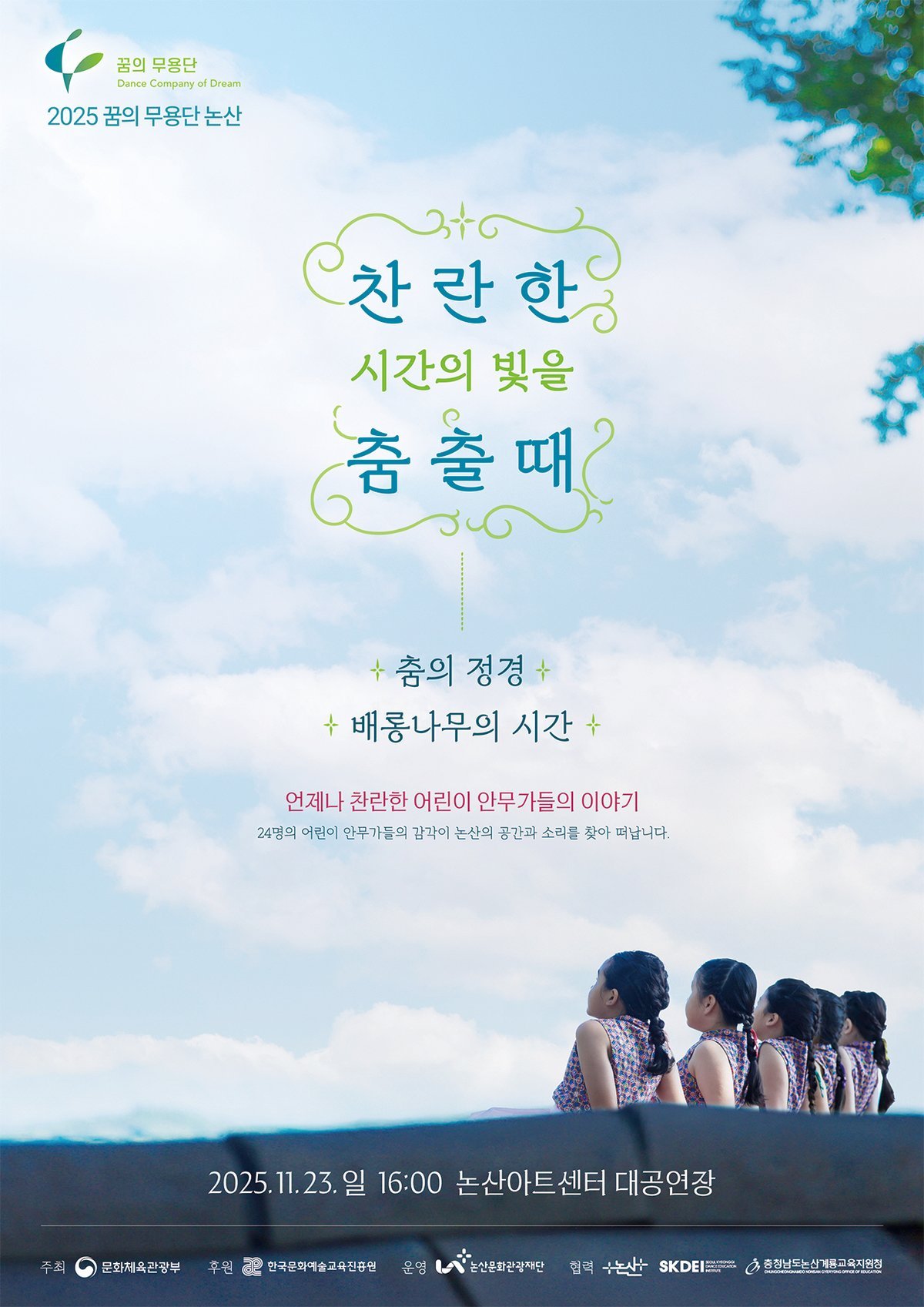[충청중심뉴스] 논산문화관광재단이 오는 11월 23일 오후 4시 논산아트센터 대공연장에서 2025 꿈의 무용단 논산 정기공연 ‘찬란한 시간의 빛을 춤출때’를 개최한다고 밝혔다.