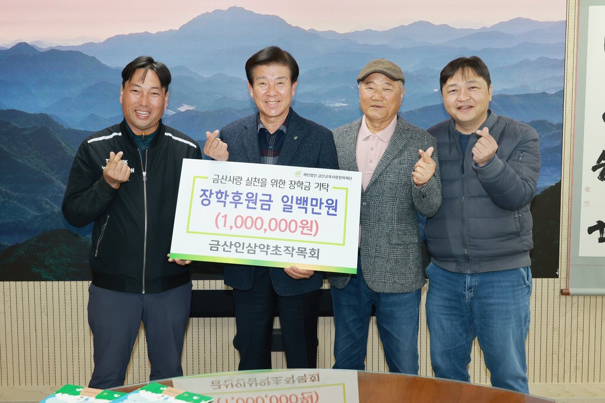 [충청중심뉴스] 금산인삼약초작목회는 지난 6일 금산군청에서 금산교육사랑장학재단에 장학금 100만원을 기탁했다.