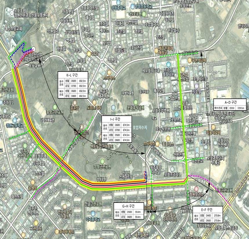 사업 규모는 오창읍 각리 일원에 공업용수 송·배수관 3.1km, 생활용수 송·배수관 3.8km로 총 6.9km의 상수관로를 설치한다.