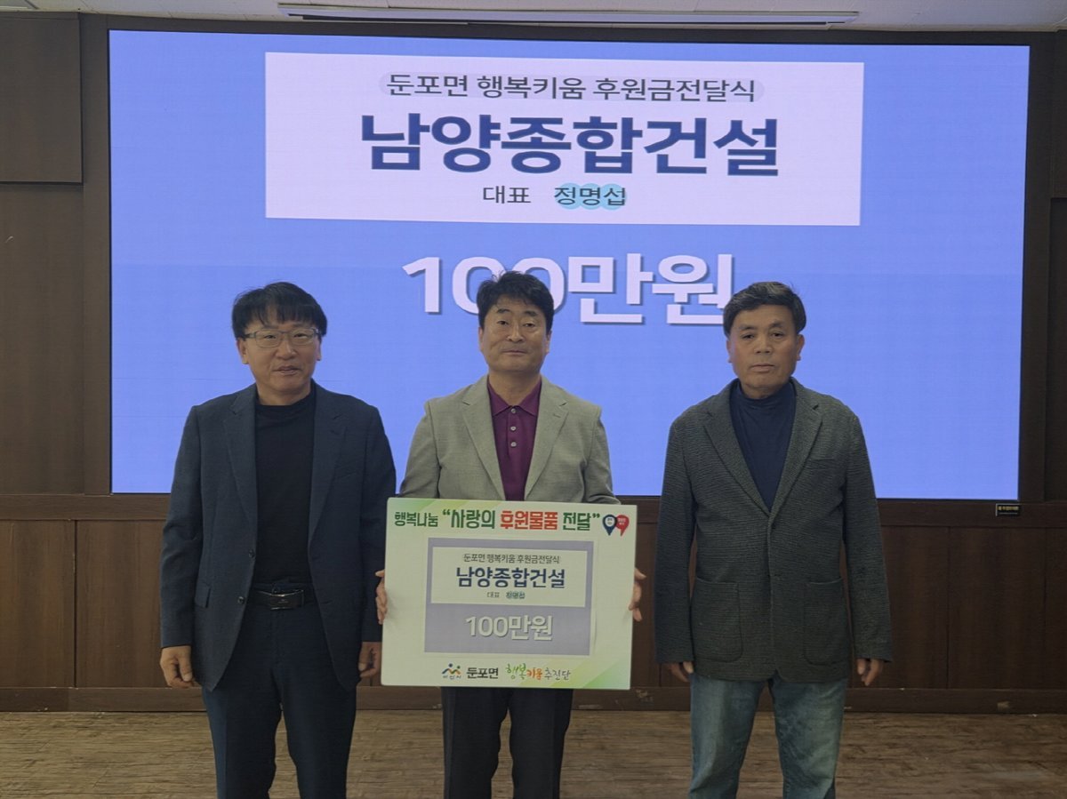 [충청중심뉴스] 아산시 둔포면 행복키움추진단은 7일 남양종합건설㈜로부터 관내 취약계층 지원을 위한 이웃사랑 후원금 100만원을 전달받았다.