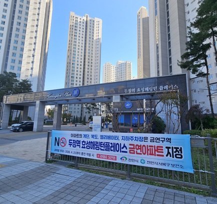 두정역 효성해링턴플레이스 아파트는 지난 9월 거주 세대 절반 이상의 동의를 받아 금연구역 지정 신청서를 제출했으며 서북구 제37호 금연아파트로 최종 지정됐다.