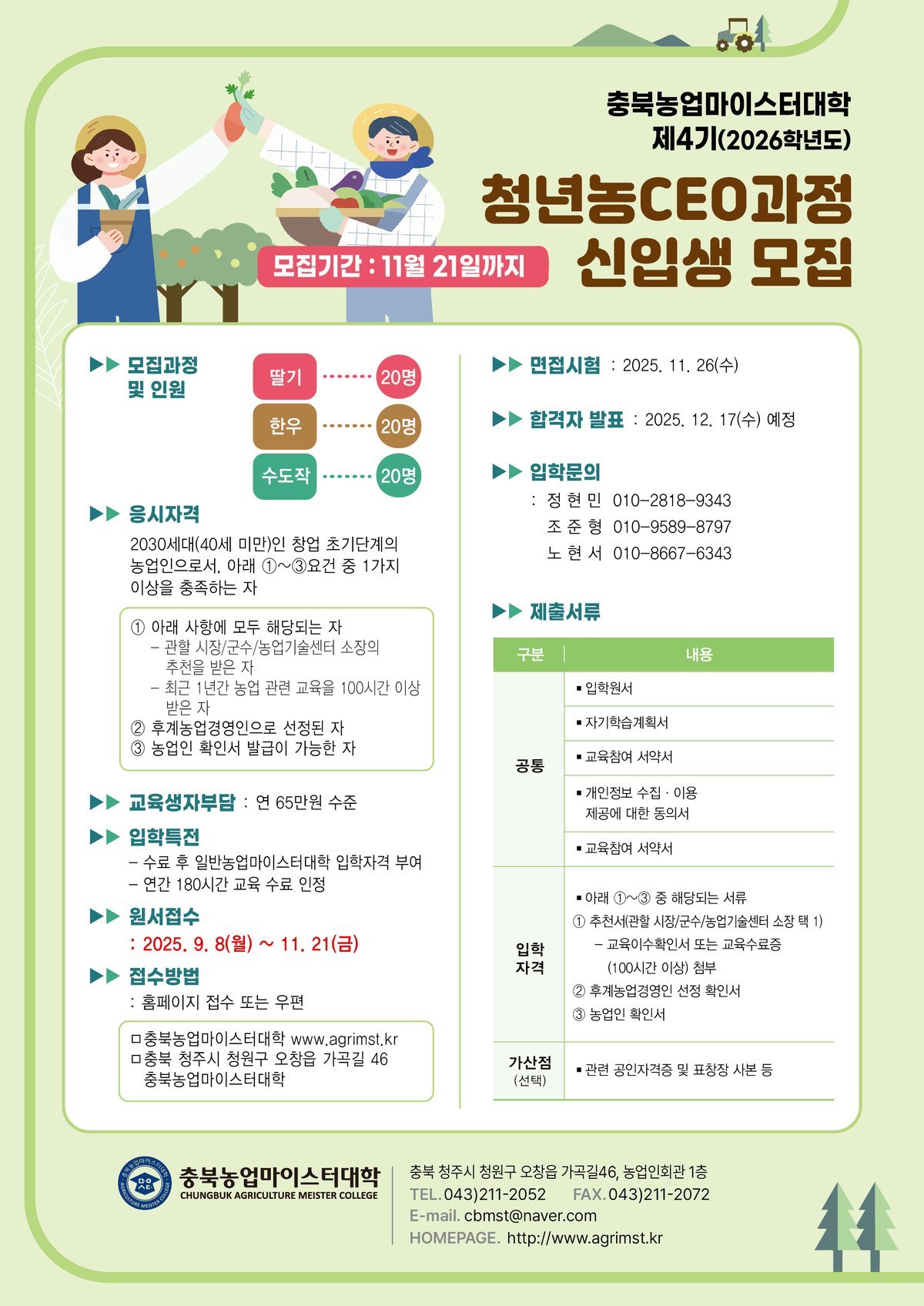 [충청중심뉴스] 충북농업기술원은 충북도와 농림축산식품부의 지원으로 운영되는 충북농업마이스터대학의 ‘2026년 제4기 청년농 CEO과정’신입생을 오는 11월 30일까지 모집한다고 밝혔다.