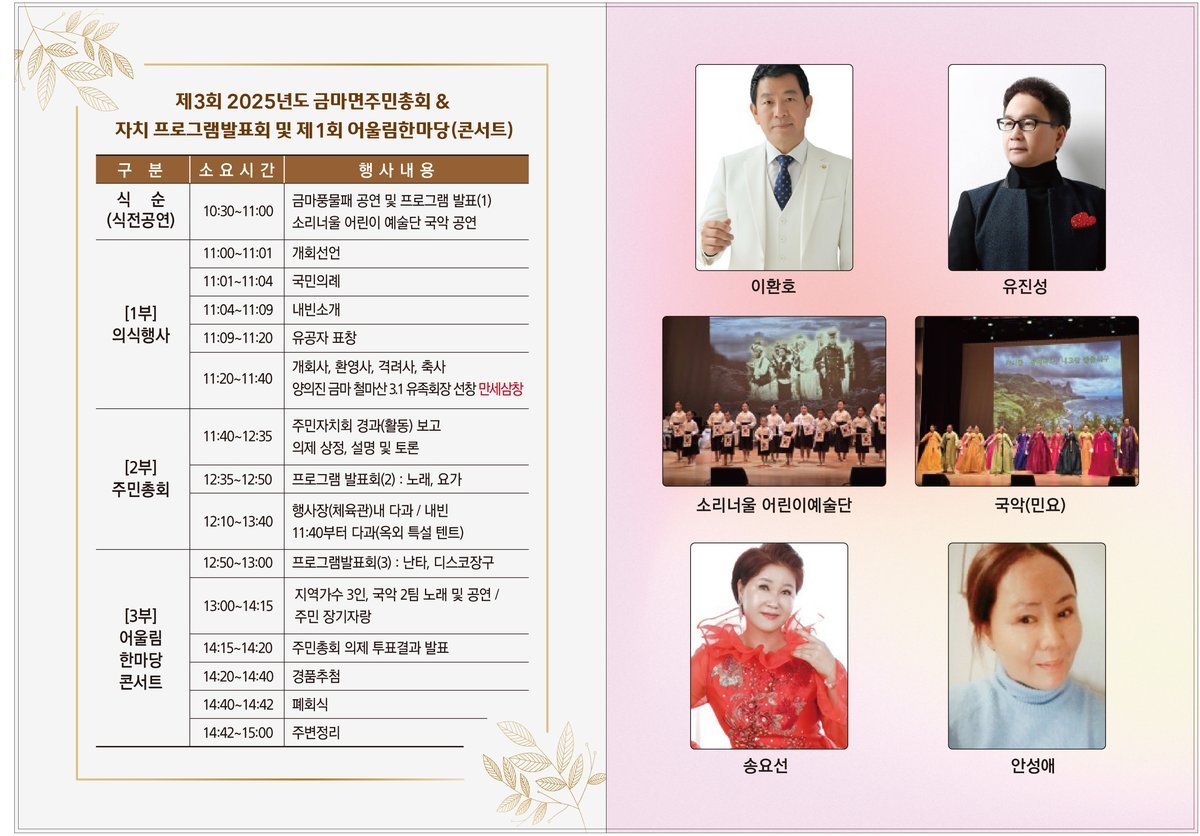 [충청중심뉴스] 홍성군 금마면주민자치회가 주민과 함께 만들어가는 행복마을 제3회 금마면주민총회 및 제1회 어울림한마당 콘서트를 오는 15일 금마초등학교 봉수관에서 개최한다,광복 80주년 및 철마산 3.1독립운동 106주년을 기념해 열리는 이번 금마면 주민총회는 금마 철마산 3.1독립운동 유족회가 올봄 펴낸 ‘실록 철마산 3.1 독립운동사’를 재편집해 수록한 특별한 주민총회 자료집을 발간, 제공함으로써 한국독립운동사에 찬란히 빛나는 선조들의 애국·애족 정신을 일깨워주는 계기로 삼는다는 데에 큰 의의가 있다.