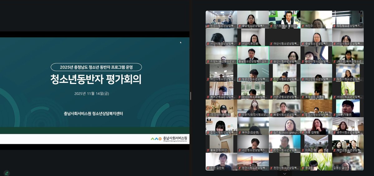 [충청중심뉴스] 충남사회서비스원은 11월 14일 충청남도 16개 도, 시·군 청소년상담복지센터 청소년동반자 및 사업담당자 70여명이 모여 2025년 ‘충청남도 청소년동반자 프로그램’평가회의를 비대면으로 개최했다.