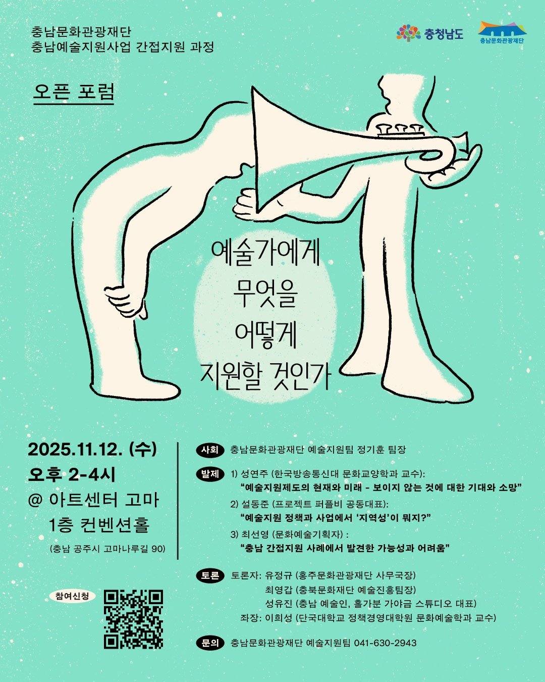 이지원 문예진흥본부장은 “이번 포럼은 충남 예술지원정책이 예술가 중심의 간접지원 체계로 전환되는 계기”며 “충남의 간접지원은 예술가들이 교류하고 영감을 나누는 전국에서도 보기 드문 독창적인 모델이 될 것”이라고 말했다.