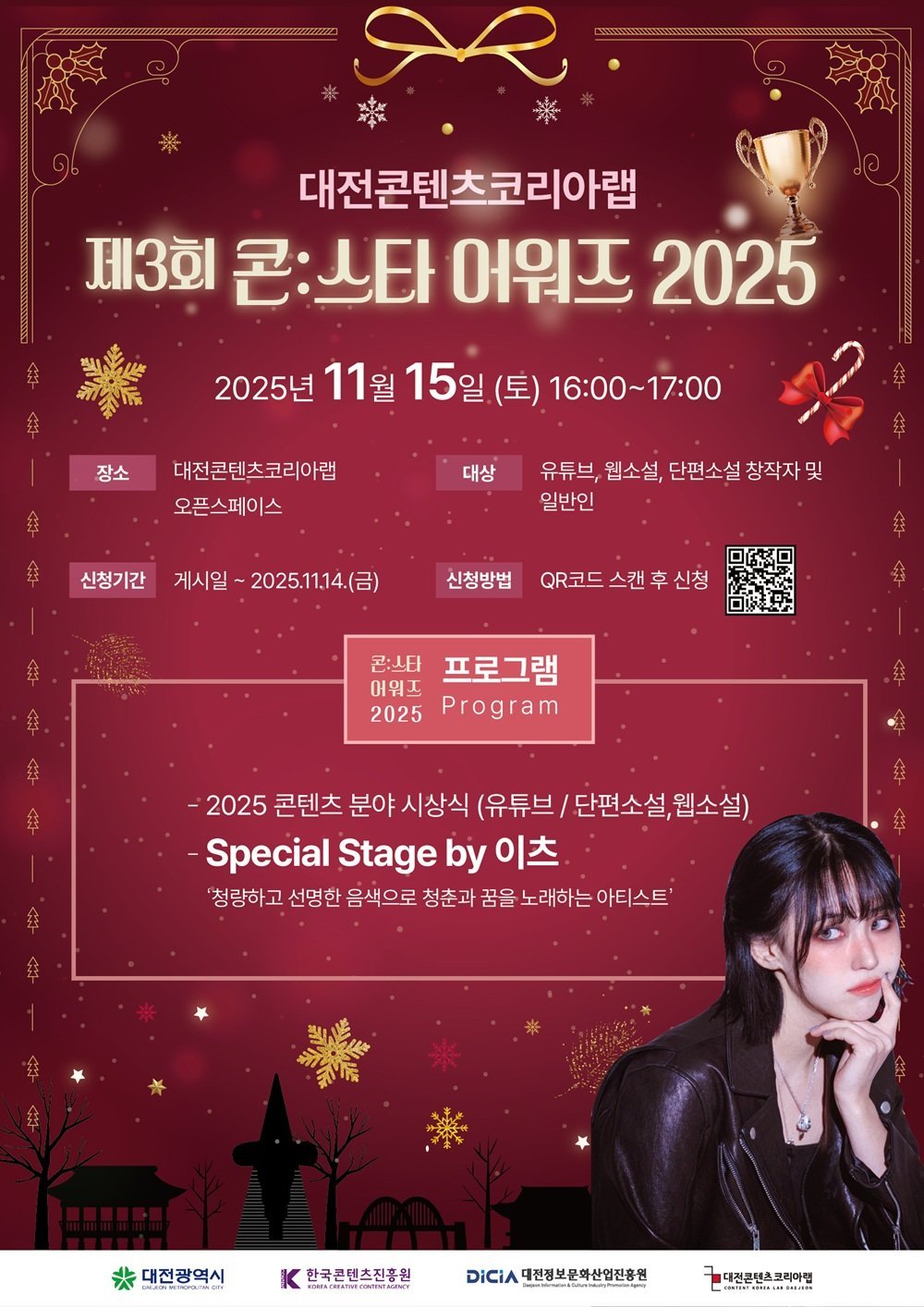 [충청중심뉴스] 대전시는 15일 대전콘텐츠코리아랩에서 ‘2025 콘스타어워즈’를 열고 웹소설·단편소설·유튜브 분야에서 우수한 콘텐츠를 선보인 21개 팀을 시상했다.