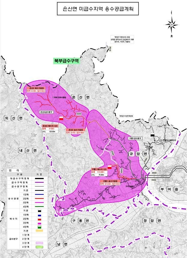 이번 사업은 총사업비 490 억원 이 투입되는 대규모 사업으로 , 2026 년부터 2031 년까지 약 6 년 동안 부여군 은산면 북부 4 개 리 지역 에 상수관로 약 47km 신설 , 배수지 2 개소 및 가압장 3 개소를 신설해 지방상수도를 안정적으로 보급하는 사업이다.