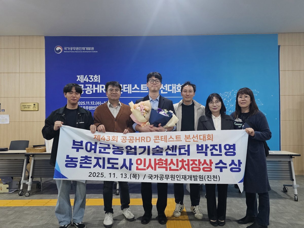 [충청중심뉴스] 부여군농업기술센터는 국가공무원인재개발원이 주관한 ‘제43회 공공HRD 콘테스트’교수 학습 분야에서 박진영 지도사가 ‘인사혁신처장상’을 수상했다고 18일 밝혔다.
