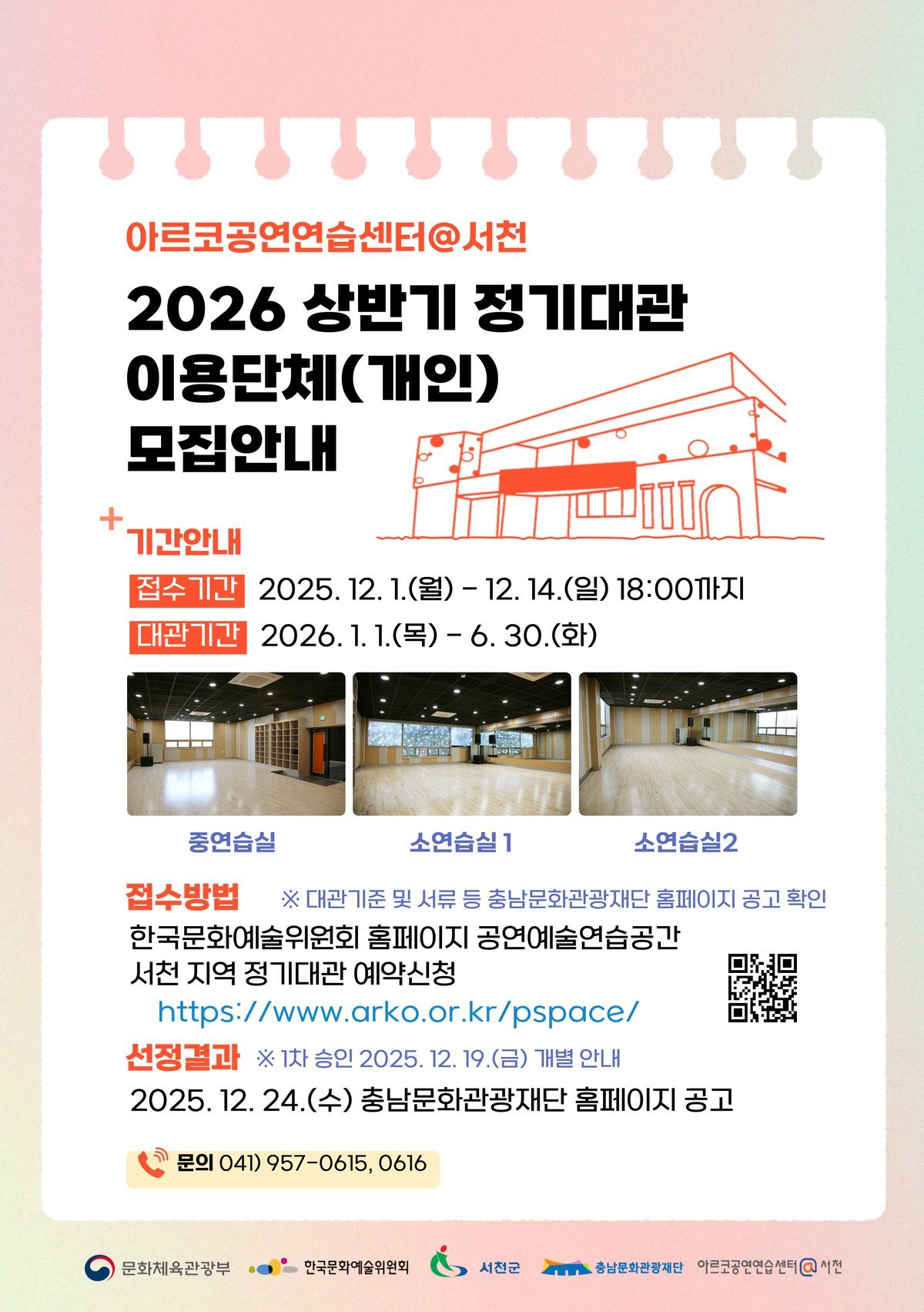 [충청중심뉴스] 충남문화관광재단은 12월 1일부터 12월 14일까지 2026년 아르코 공연연습센터@서천의 상반기 정기대관 이용 단체 및 예술인을 모집한다.