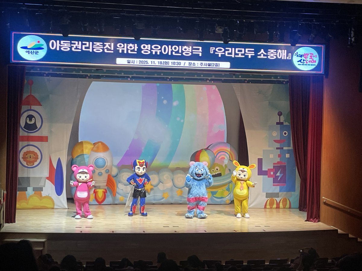 [충청중심뉴스] 예산군은 지난 18일 군청 추사홀에서 관내 어린이집 재원 아동 300명을 대상으로 아동 권리 증진을 위한 인형극 ‘우리모두 소중해’ 공연을 개최했다.
