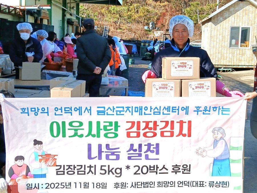 [충청중심뉴스] 지역봉사단체 희망의 언덕은 지난 18일 지역 내 취약계층을 위해 금산군치매안심센터에 김장김치 5kg 20상자 총 100kg을 기탁했다.