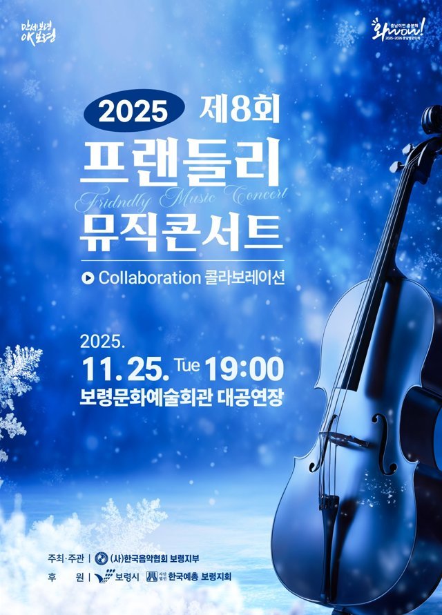 [충청중심뉴스] 한국예총 보령지회 음악지부가 주관하는 ‘제8회 프렌들리 음악회’가 오는 11월 25일 오후 7시 보령문화예술회관 대공연장에서 개최되어 보령시민들에게 특별한 문화향유의 기회를 제공한다.