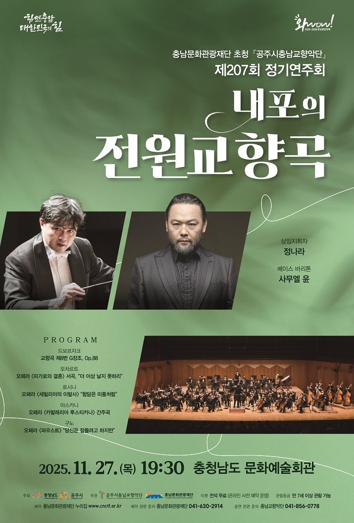 이번 연주회는 11월 27일 저녁 7시 30분, 충남도청 문예회관에서 열리며 베이스바리톤 사무엘 윤의 깊고 단단한 울림과 드보르자크의 ‘교향곡 제8번’을 감상할 수 있다.