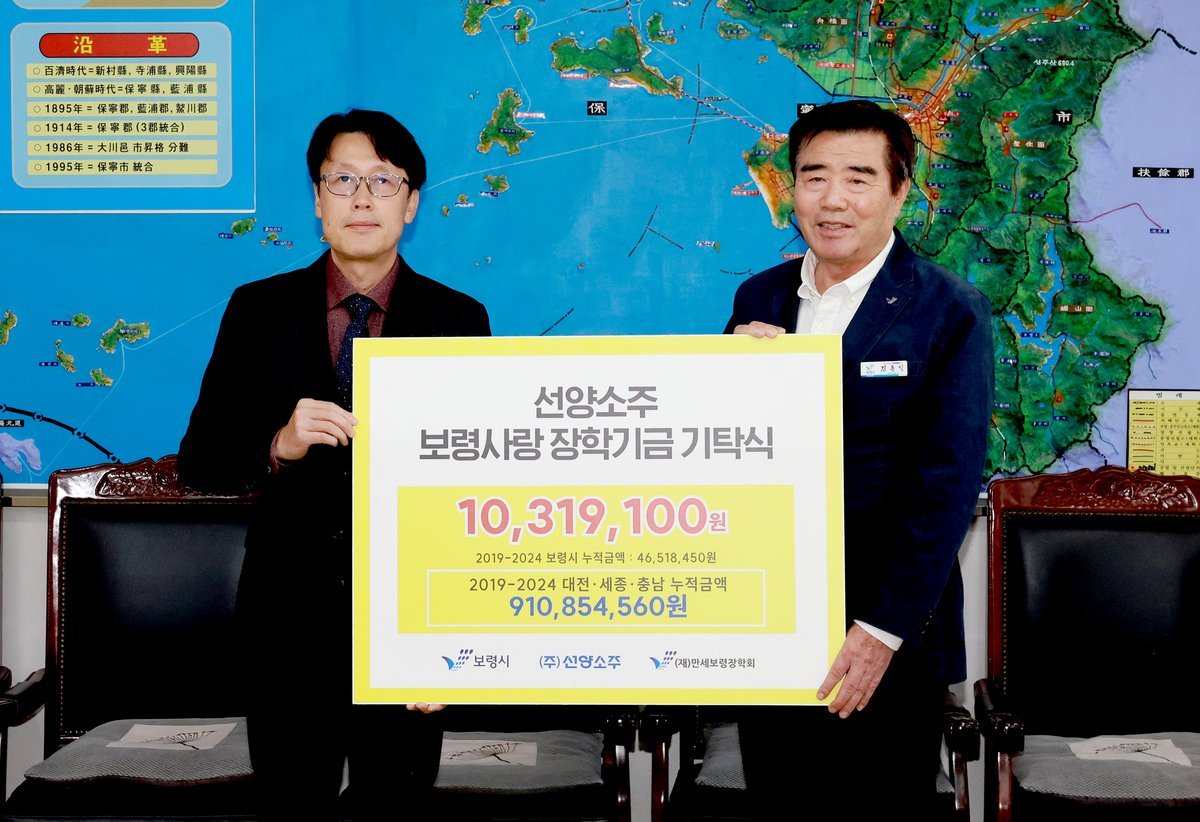 [충청중심뉴스] 보령시는 지난 20일 시장실에서 김동일 보령시장과 강재규 ㈜선양소주 영업본부장 등이 참석한 가운데 만세보령장학금 전달식을 가졌다고 밝혔다.