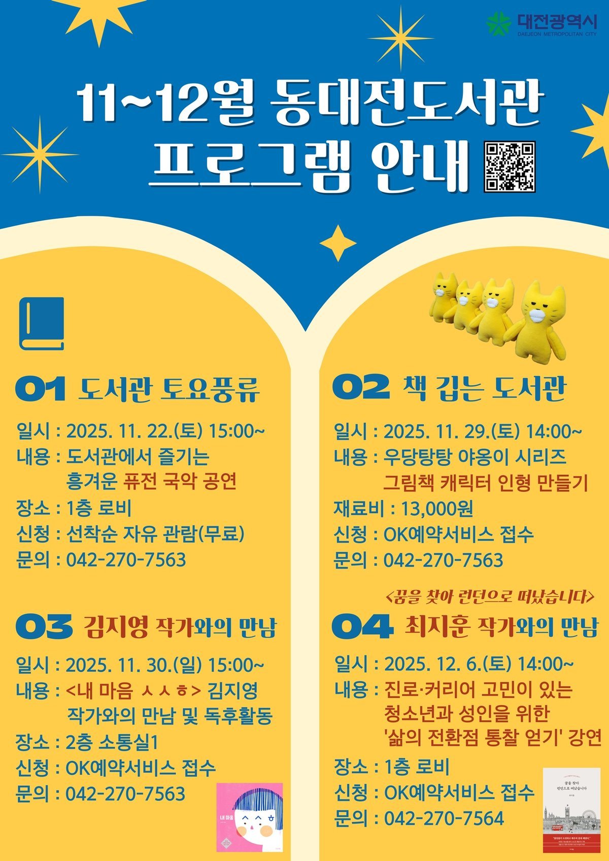 [충청중심뉴스] 대전시 동대전도서관은 2025년 연말을 맞아 11월부터 12월까지 어린이, 청소년, 성인 등을 대상으로 다양한 독서문화 프로그램을 준비했다.