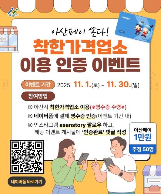 착한가격업소 이용 후, 시에서 운영하는 네이버폼 인증페이지에 영수증 사진을 게시하고, 아산시 인스타그램 해당 이벤트 게시물에 ‘인증완료’댓글을 작성하면 참여가 완료된다.