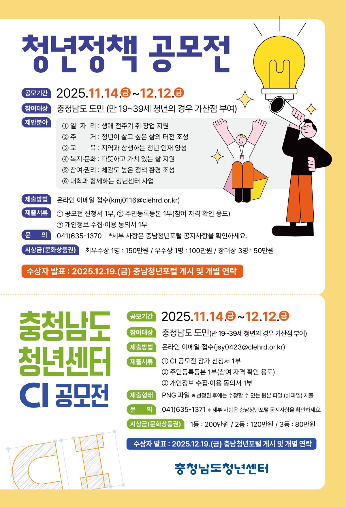 [충청중심뉴스] _청년정책 공모전 및 충청남도 청년센터 CI 공모전 홍보 포스터충청남도 청년센터는 충청남도 청년의 창의적인 의견을 수렴하고 청년 정책 활성화를 도모하기 위해‘2025 충청남도 청년정책 공모전’과 ‘충청남도 청년센터 CI 공모전’을 지난 11월 14일부터 12월 12일까지 동시에 개최한다고 밝혔다.