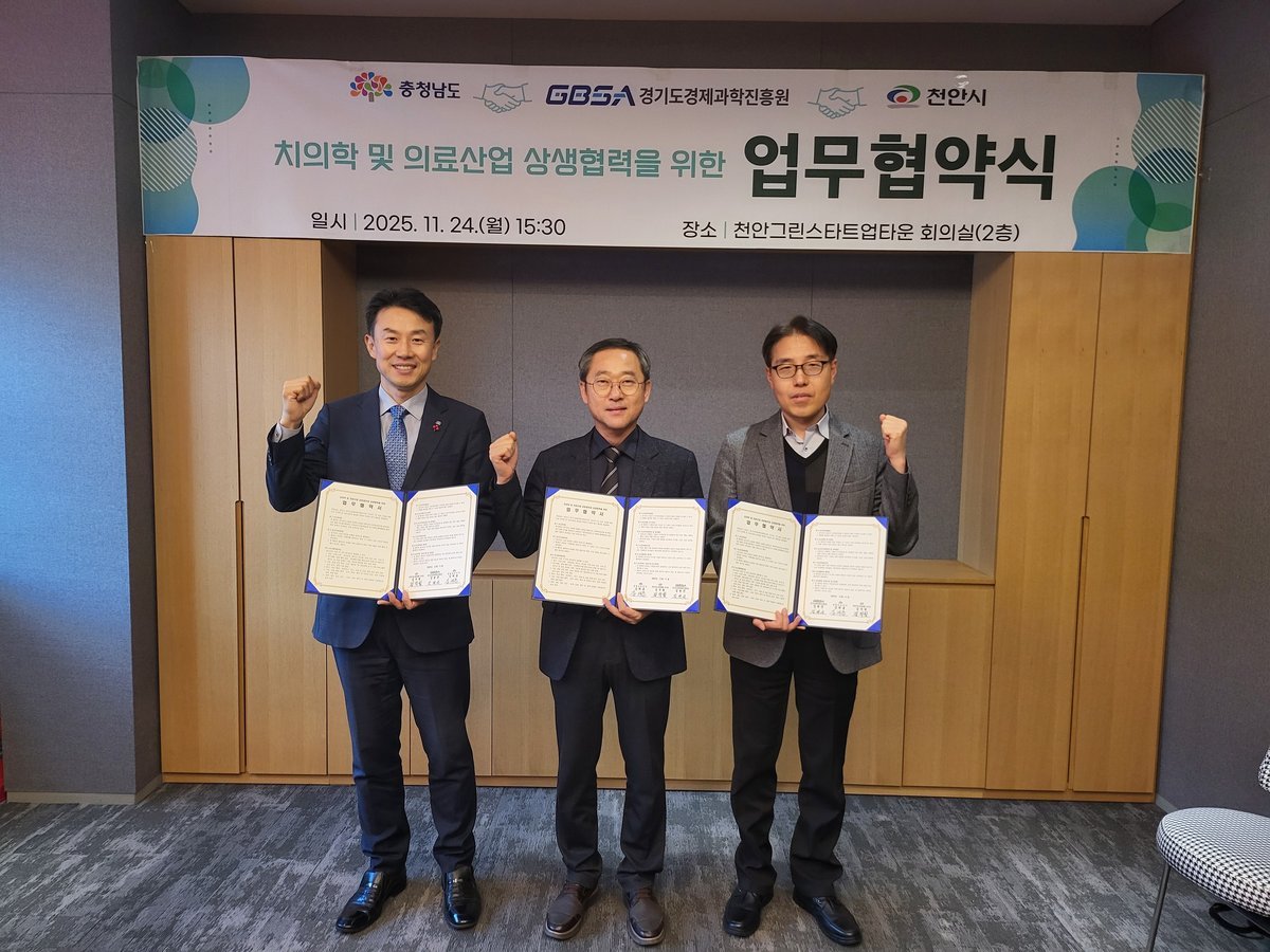 협약에 따라 각 기관은 △디지털 덴티스트리 분야 공동 연구 및 실증 협력 △천안–경기 간 투자 네트워크 연계를 통한 스타트업 지원 △인공지능·디지털 치의학 전문 인력 교류 등 산업 전반의 경쟁력 강화를 위한 협력을 추진할 계획이다.