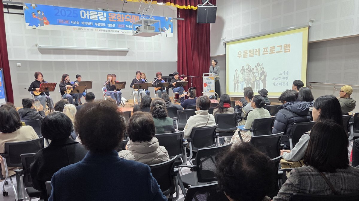 ‘2025 어울림문화축제’는 22일 발표공연을 시작으로, 12월 5일까지 어울림동 전시 공간에서 작품 전시가 이어진다. 발표공연에는 우쿨렐레, 바이올린, 시낭송, 팬플루트, 통기타 등 다양한 프로그램이 무대에 올랐으며, 전시에는 보태니컬아트, 전통민화, 캘리그라피, 수묵화, 어반스케치, 인물화, 유화 등 다양한 장르의 작품이 펼쳐진다.