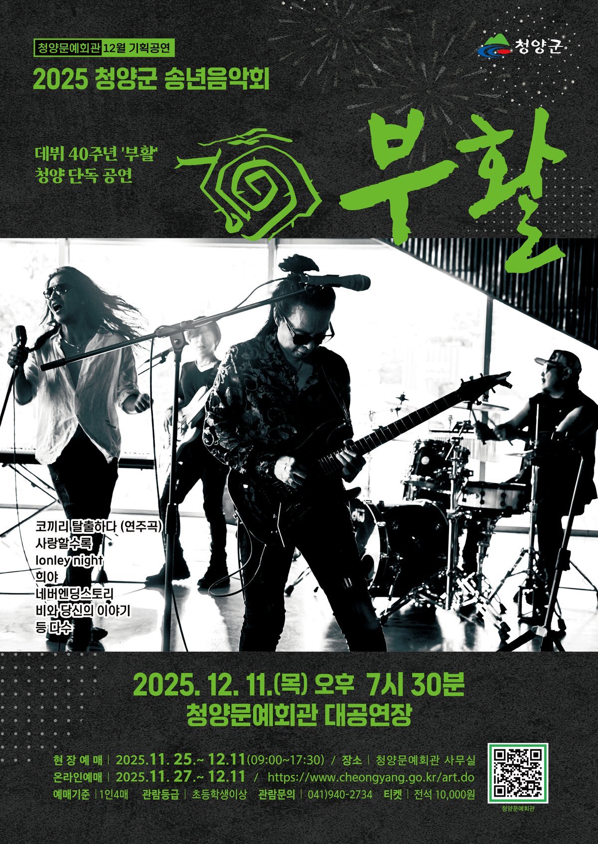 [충청중심뉴스] 청양군은 오는 12월 11일 저녁 7시 30분, 청양문예회관 대공연장에서 대한민국을 대표하는 록 그룹 ‘부활’의 공연을 개최한다고 밝혔다.