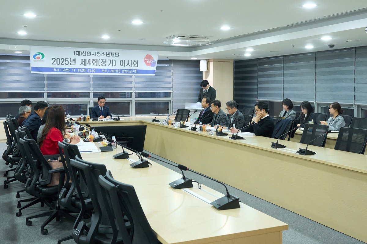 [충청중심뉴스] 천안시청소년재단은 지난 25일 천안시청 중회의실에서 2025년 제4회 정기 이사회를 열고 재단 규정 일부개정과 내년 사업 추진 방향 등을 논의했다.