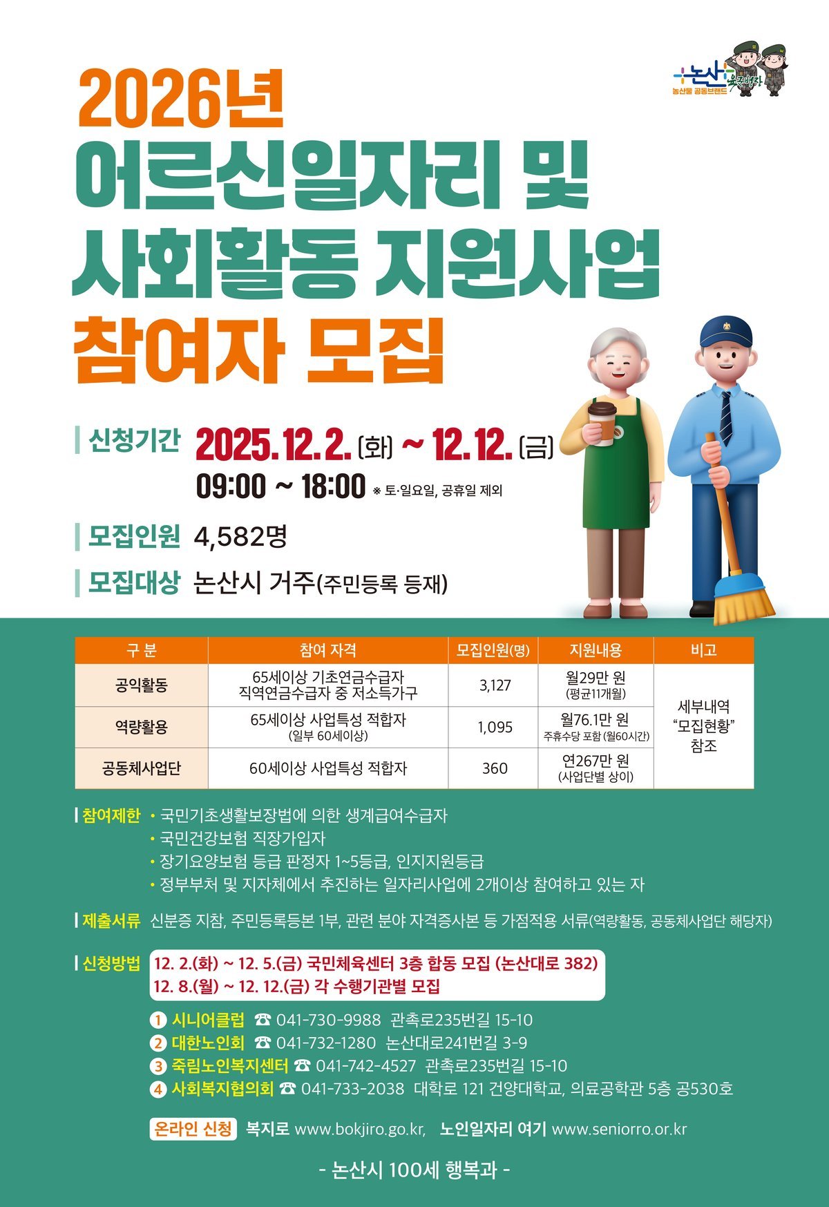 [충청중심뉴스] 논산시는 2026년도 어르신일자리 및 사회활동 지원사업 참여자를 오는 12월 2일부터 12일까지 모집한다고 밝혔다.