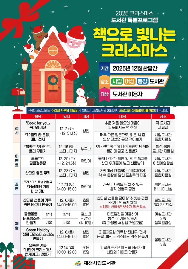 [충청중심뉴스] 제천시립도서관은 2025년 연말을 맞이하여 12월 한 달간 특별프로그램 ‘책으로 빛나는 크리스마스’를 운영한다.