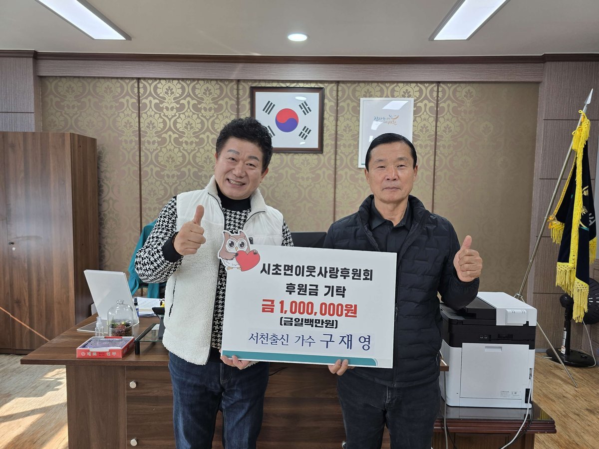 [충청중심뉴스] 서천군 시초면 출신 가수 구재영 씨가 지역의 취약계층을 돕기 위해 시초면이웃사랑후원회에 후원금 100만원을 기탁했다.