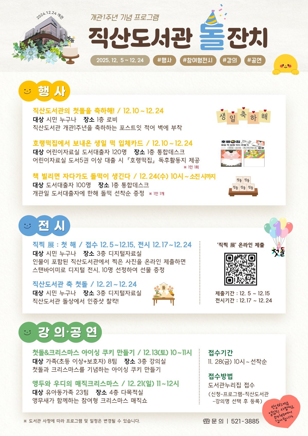 직산도서관 돌잔치에서는 △개관 1주년 축하 메시지 ‘첫돌을 축하해’△책 빌리면 자다가도 돌떡이 생긴다 △직찍 전 : 첫 해 △첫돌&크리스마스 아이싱 쿠키 만들기 △앵두와 우디의 매직 크리스마스 공연 등이 진행될 예정이다.