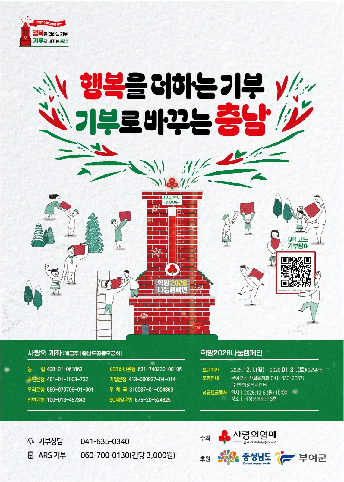 [충청중심뉴스] 부여군은 충남사회복지공동모금회와 함께 내달 1일부터 2026년 1월 31일까지 62일간 ‘희망 2026 나눔 캠페인’을 실시한다고 밝혔다.